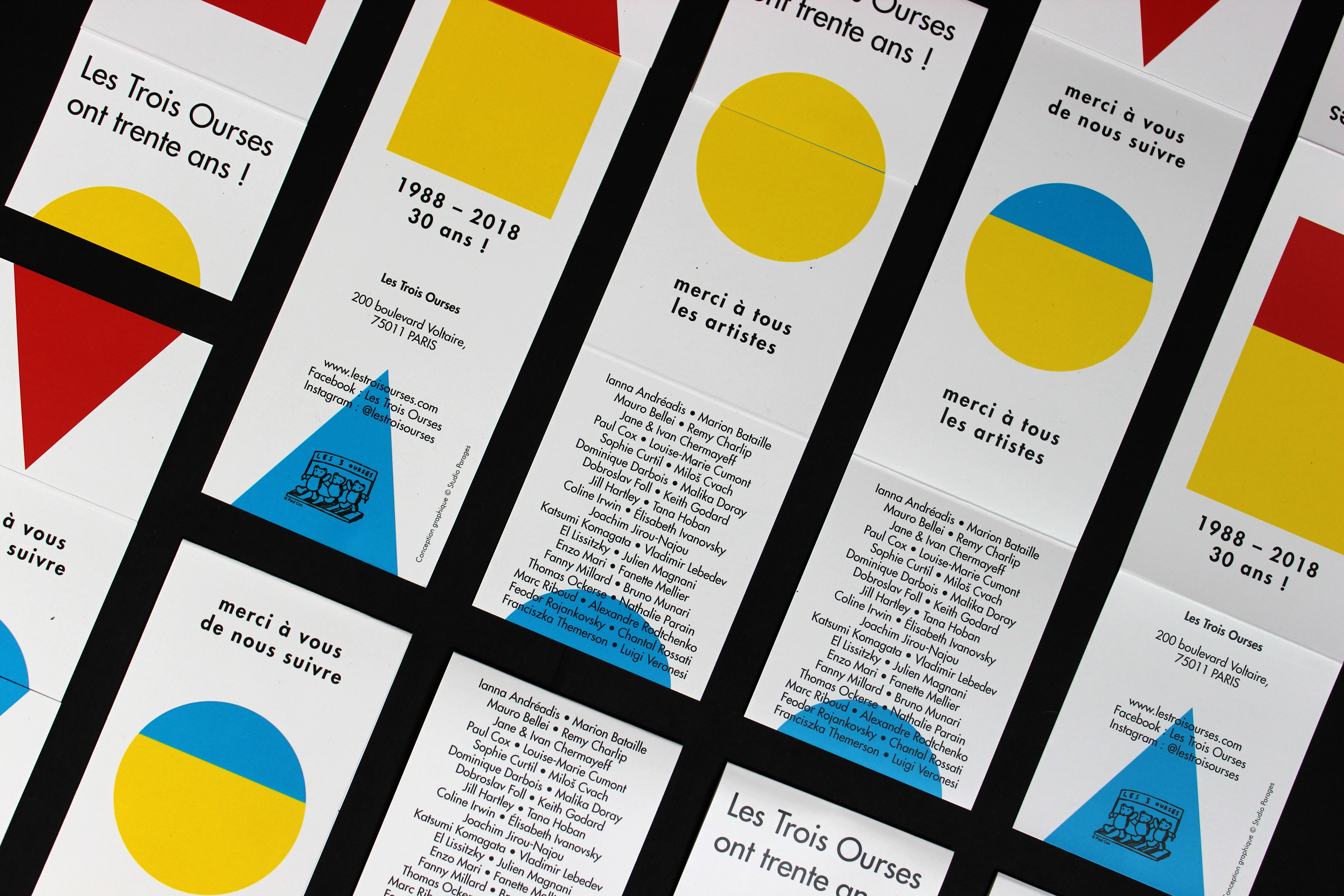 Objet de fête, et de remerciements aux artistes avec lesquels l’association a travaillé, ce marque-page marquait aussi la dernière année d’existence de cette association qui a arrêté son activité l’année de ses 30 ans. Les livres édités et diffusés par les Trois Ourses sont souvent sans texte, certains sont destinés aux enfants qui ne savent pas encore lire. Ces livres se jouent autant qu’ils se lisent.